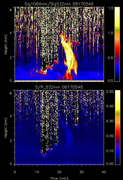 Ratio of 1064-nm signal to 532-nm signal (upper) and depolarization ratio at 532 nm (lower)