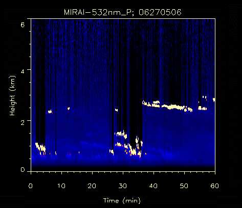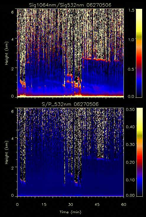 Ratio of 1064-nm signal to 532-nm signal (upper) and depolarization ratio at 532 nm (lower)