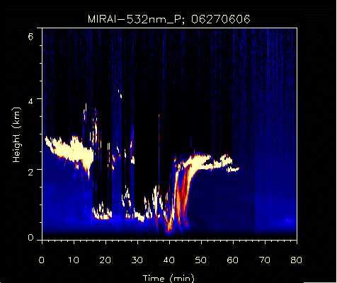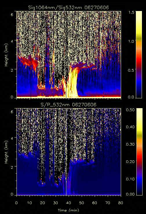 Ratio of 1064-nm signal to 532-nm signal (upper) and depolarization ratio at 532 nm (lower)