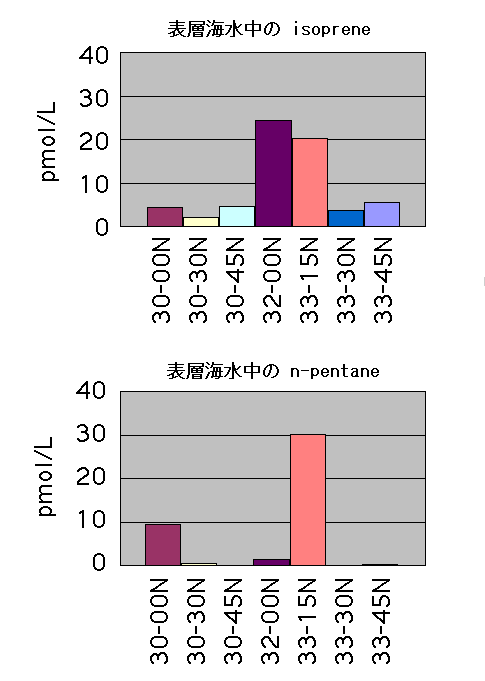表層海水(10m)のイソプレンとn-pentane 濃度。