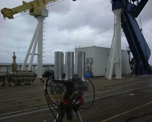今回の実験では、三脚に取り付けた受光系を、散乱角が179度前後になるように甲板上に設置して低層の雲を測定した。レーザーは偏波面が散乱面に45度になるように送信した。測定では、波長 532nm の散乱光の2つの偏光成分、すなわち散乱面に垂直と平行の偏光成分を独立に受信した。この2つの偏光成分の比(Pr/Pl)が粒径の情報を含んでいる。