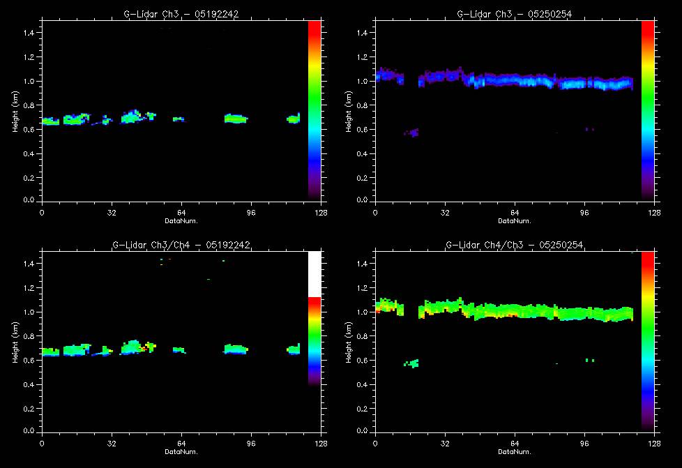 下図にそれぞれの場合の実験結果を示す。上段は信号強度、下段は2つの偏光成分の比(Pr/Pl)である。それぞれ、高度時間断面で、横軸は10秒毎のデータ番号で表示してある(20分間に対応)。比の値(Pr/Pl)は、高度にも依存するが、同じ高度で比較すれば定性的に、大きいほど、すなわち図では赤いほど粒径が大きいことを表す。