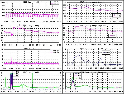 ●8:00あたりにCO、NOxが増加しており、これも陸地からの影響と考えられるが、 上記の4:00-6:00とは発生源が異なっているのであろう。