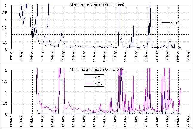 ●16日後半のSO2、NO、NOx増加およびオゾン減少は船の排気の影響。